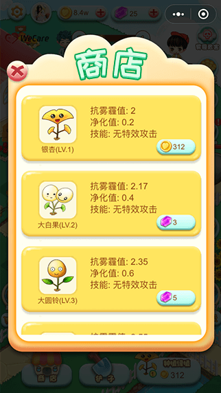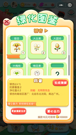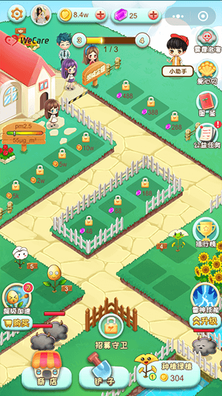游戏特色:采用挂机养成的方式,模拟绿植种植、成长的过程;采用合成的方式升级绿植的种类或等级;采用关卡模式控制游戏节奏,逐步提升难度;采用RPG角色与玩家互动,带动玩家参与游戏积极性;用博弈的方式动态表现绿植种类和数量对PM2.5值的影响;用卡通人物的行为变化模拟PM2.5波动对人类的影响;绿植和雾霾拟人化设计,以绿植阻击雾霾的动态表现过程,呈现 出绿植与雾霾水火不容的激烈场面,趣味十足